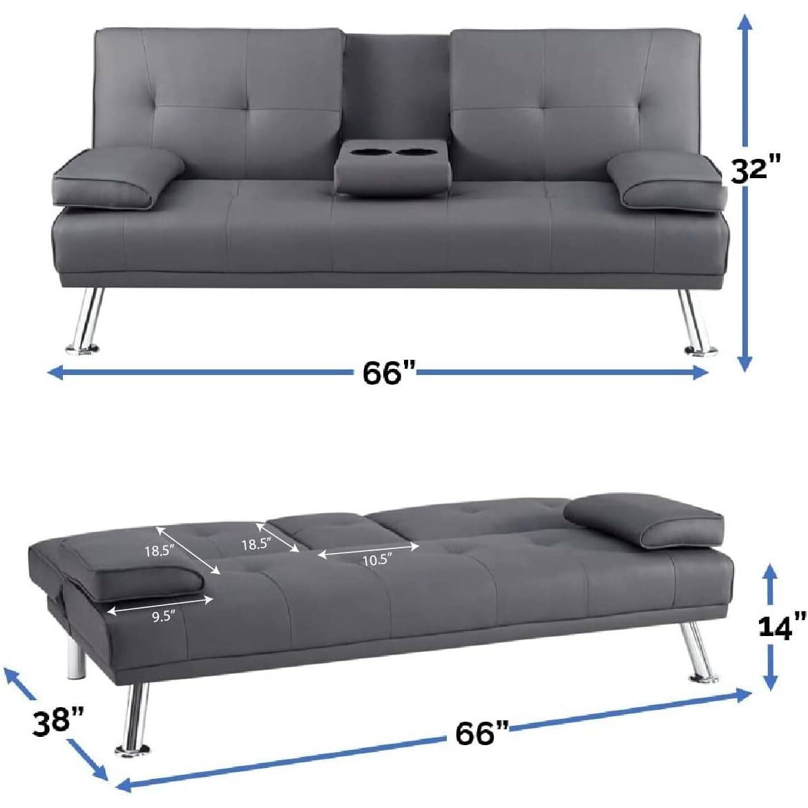 • Modern Futon Sleep Sofa Bed Couch in Grey Faux Leather with Cup Holder