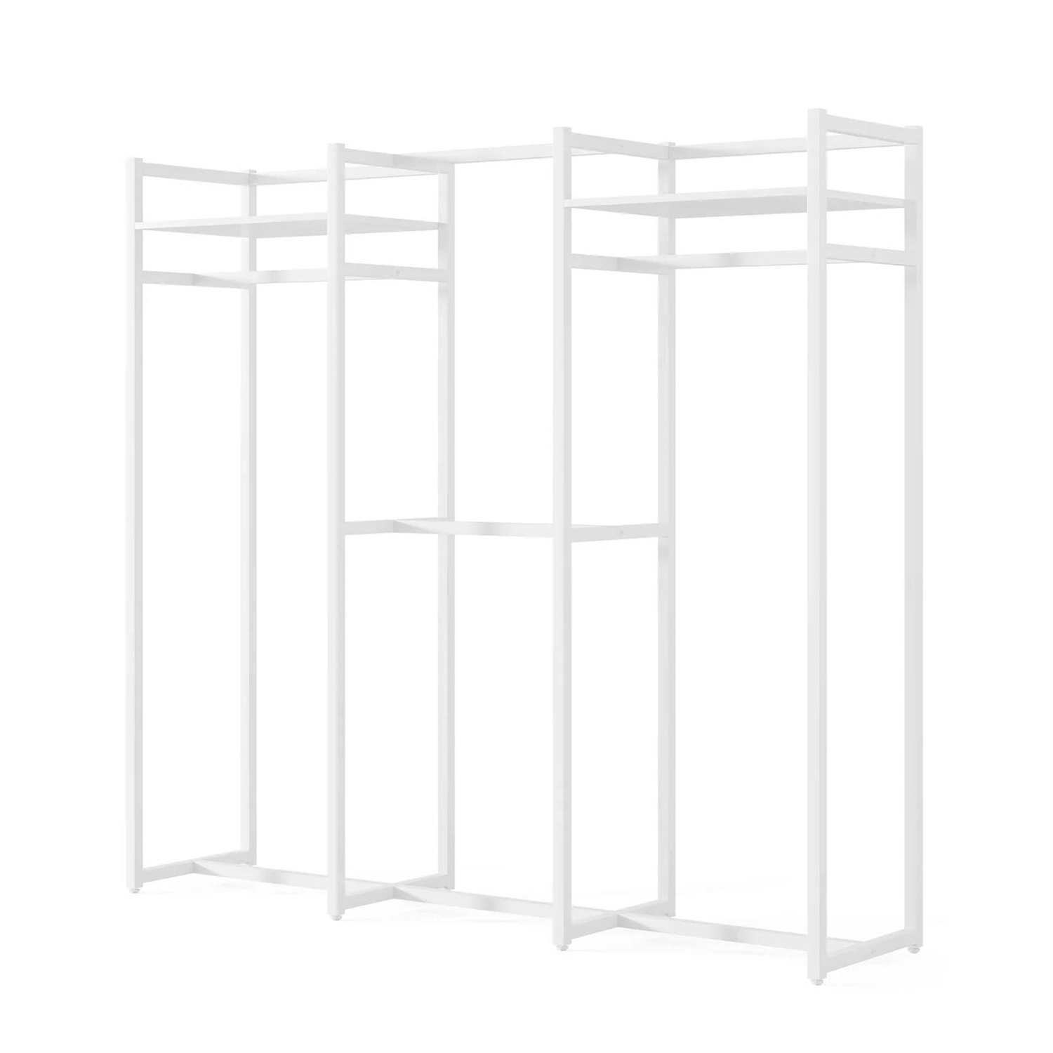 This Heavy Duty White Metal Freestanding Garment Rack with 4 Clothes Hanging Rods is perfect for clothes and shoes in cramped closets. Making small spaces more functional. The simple and chic design adds instant storage to any room. Easily transport your freestanding wardrobe. Sturdy and Durable- Heavy-duty metal frame combined with a rustic thick particle board makes it super stable and sturdy, with no wobble and collapse. Easy access to the bedroom, cloakroom, clothing store, laundry room, walk-in closet, and more. Large Storage Solution- 4 hanging rods accommodate both long and short garments. Every garment rod holds up to 50 lb. 2 open shelves ensuring you plenty of room to place clothes. And put large boxes of off-season clothes on the top for added storage.