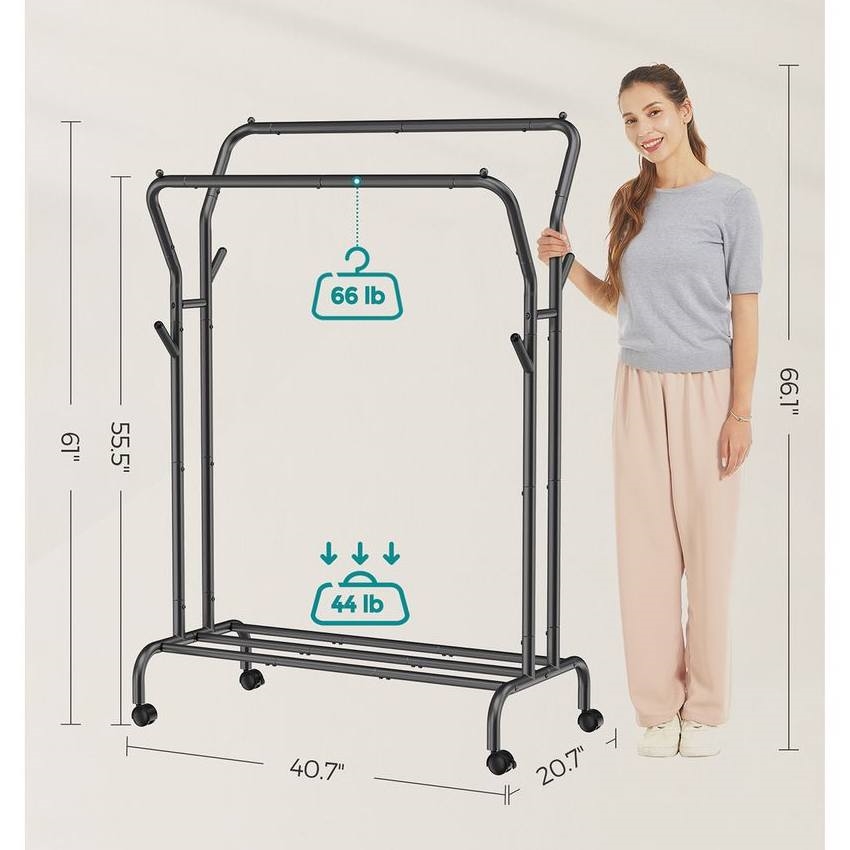 Bring everything with you anywhere you go with this Sturdy Modern Industrial Minimalistic 2 Rod Wheeled Laundry Sorter Clothing Rack! With a high rail and a low rail for hanging clothes of different lengths, hooks on both sides for bags and hats, and a bottom shelf for boxes and shoes, this clothes rack keeps all your essentials in one place. The 4 swivel wheels make it easy to move the garment rack to different rooms. For added convenience, 2 of the wheels can be locked in place to keep the rack stationary. The 16.5" spacing between 2 clothes hanging rails allows air to easily flow through, promoting quick drying. It offers ample hanging area to prevent crowded, messy clothes, making them easier to access. With bolts securing the 1" thick steel tubes, this clothing rack has a stable frame that can hold up to 220 lb. Each rail has a max. static load capacity of 66 lbs. each hook up to 11 lbs. and the bottom shelf can hold up to 44 lbs.